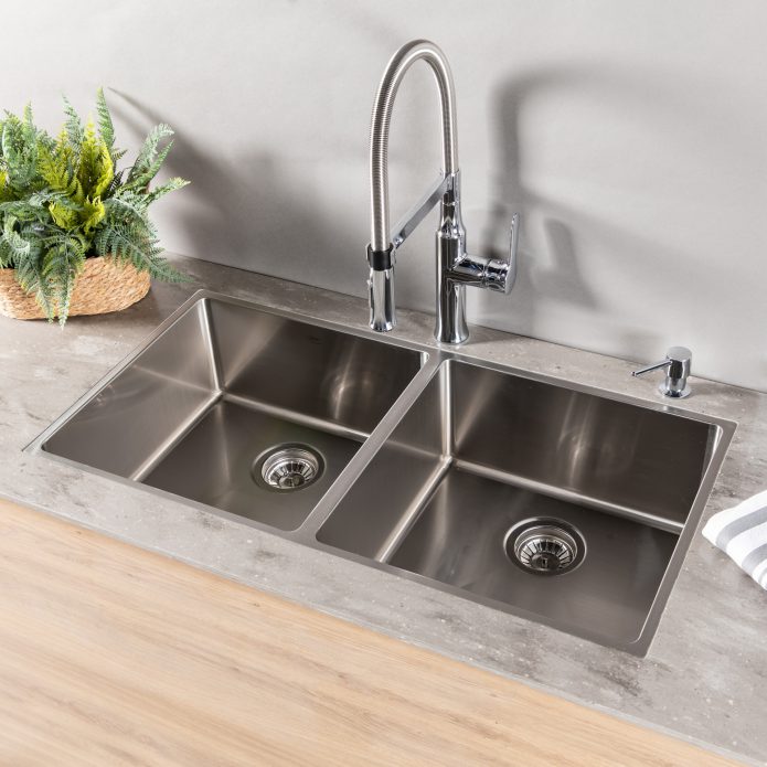 כיור נירוסטה כפול, עשוי מנירוסטה 10/18, אירופאית, שאינה מחלידה, עבה במיוחד 1.2 מ”מ, מגיע עם יציאה 3.5 איטלקית איכותית, ודיפון בגב הכיור נגד רעש של טיפות המים