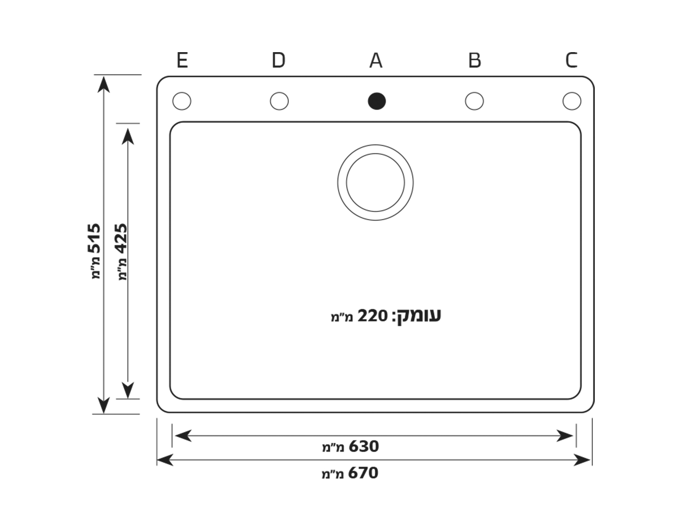 חור קיים A (בהתקנה תחתונה לא ניתן להתקין ברז בחור A )